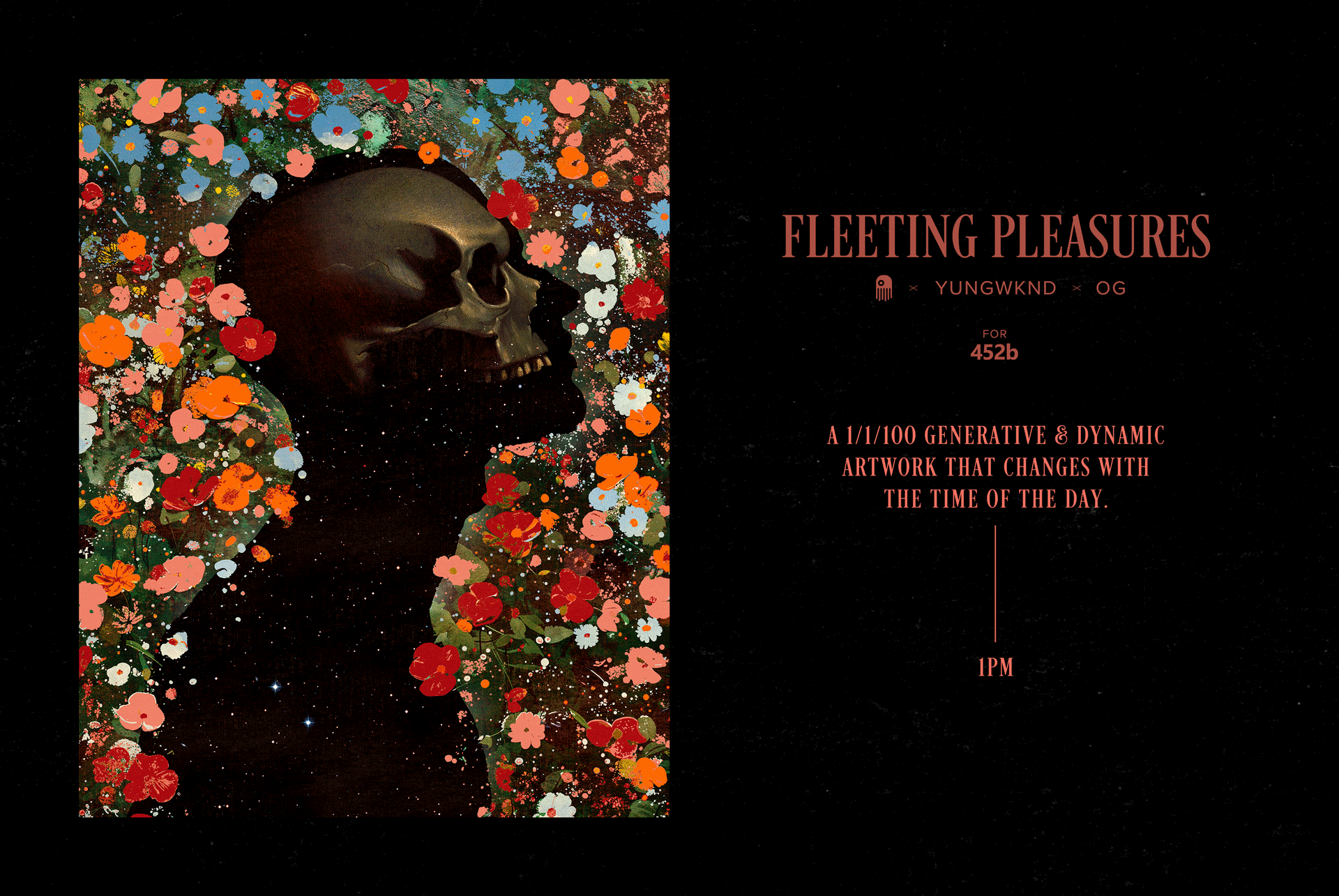 "Fleeting Pleasures" is a modern take on the classical Vanitas theme, where the juxtaposition of flowers and a human skull symbolizes the transient nature of life and the inevitability of death—a reminder of our limited time on this planet. Each piece features a unique combination of flowers, while the lighting gradually shifts throughout the day, reflecting the natural passage of time, from dawn to dusk, hour by hour. A collaborative piece between mendezmendez, yungwknd, and OG.